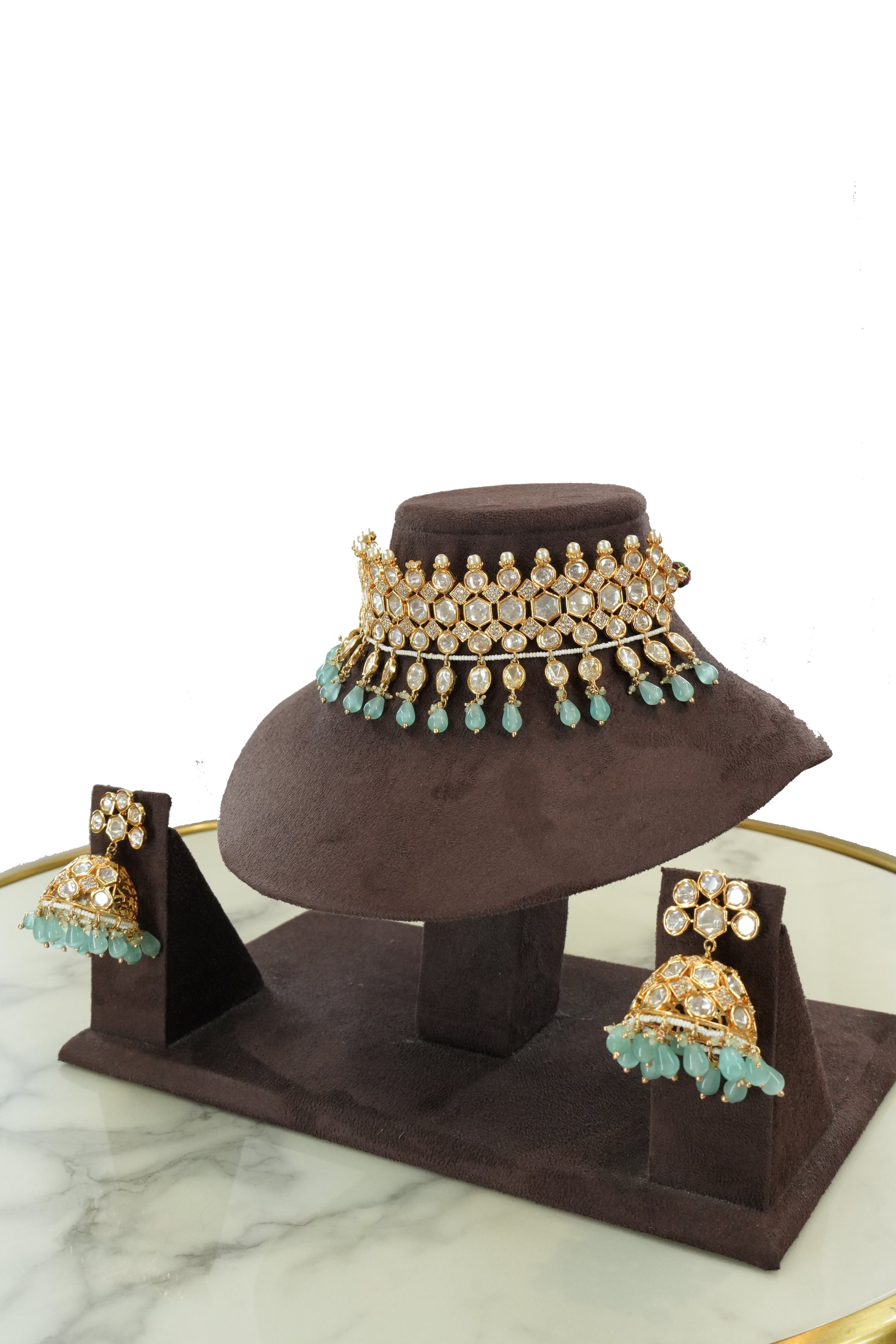 The intricate detailing and regal design make this set an ideal choice for brides or anyone looking to add sophistication to their outfit. Despite its luxurious appearance, the choker and earrings are lightweight and comfortable, making them easy to wear for long events.