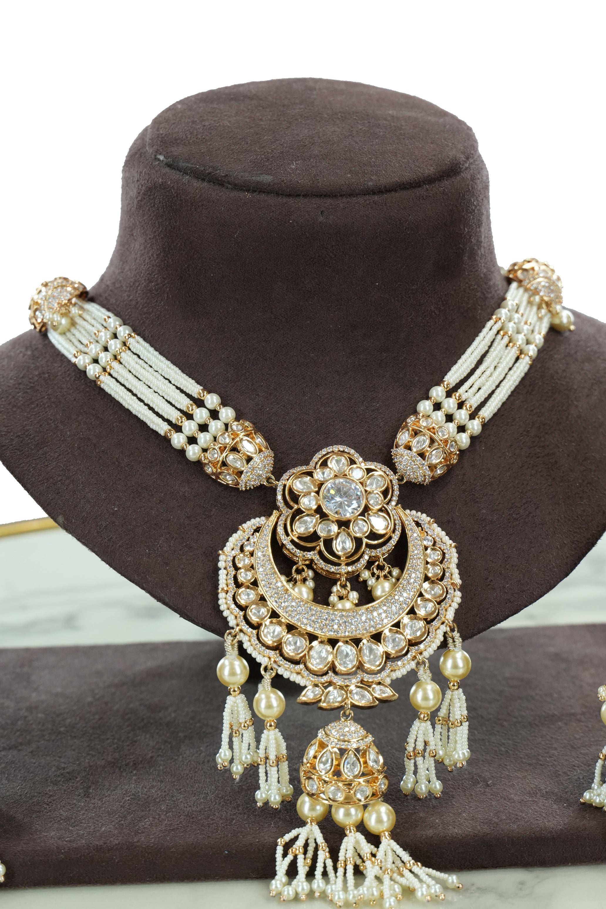Ideal for brides and women who love making a statement, this pearl and Kundan necklace set pairs beautifully with lehengas, sarees, and Anarkali suits, adding timeless grace to any outfit.
