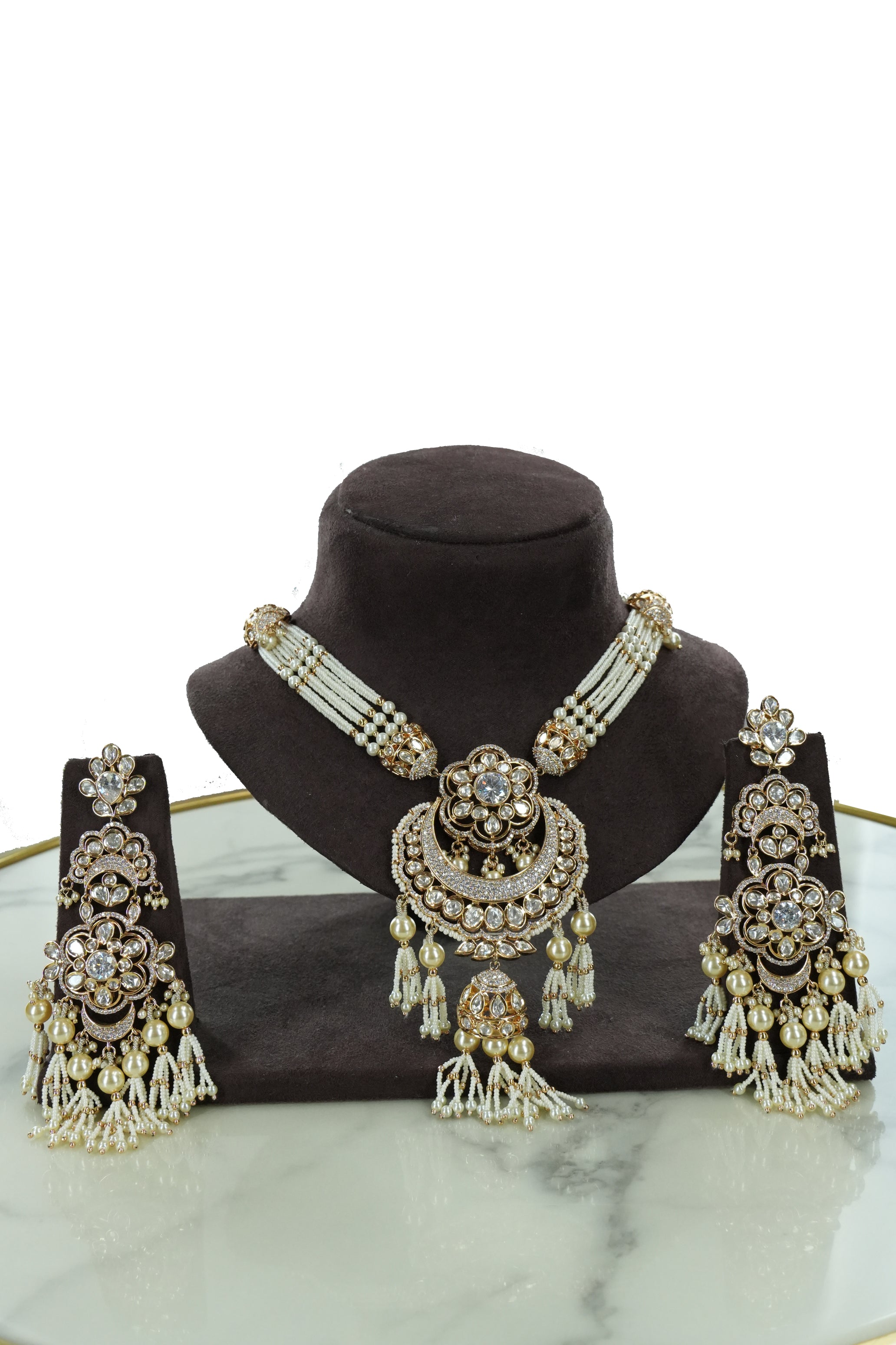 The set comes with long, statement earrings that complement the necklace effortlessly, making it a complete ensemble for traditional wear. Despite its elaborate design, this necklace set is lightweight and comfortable, allowing you to enjoy your special moments with ease.