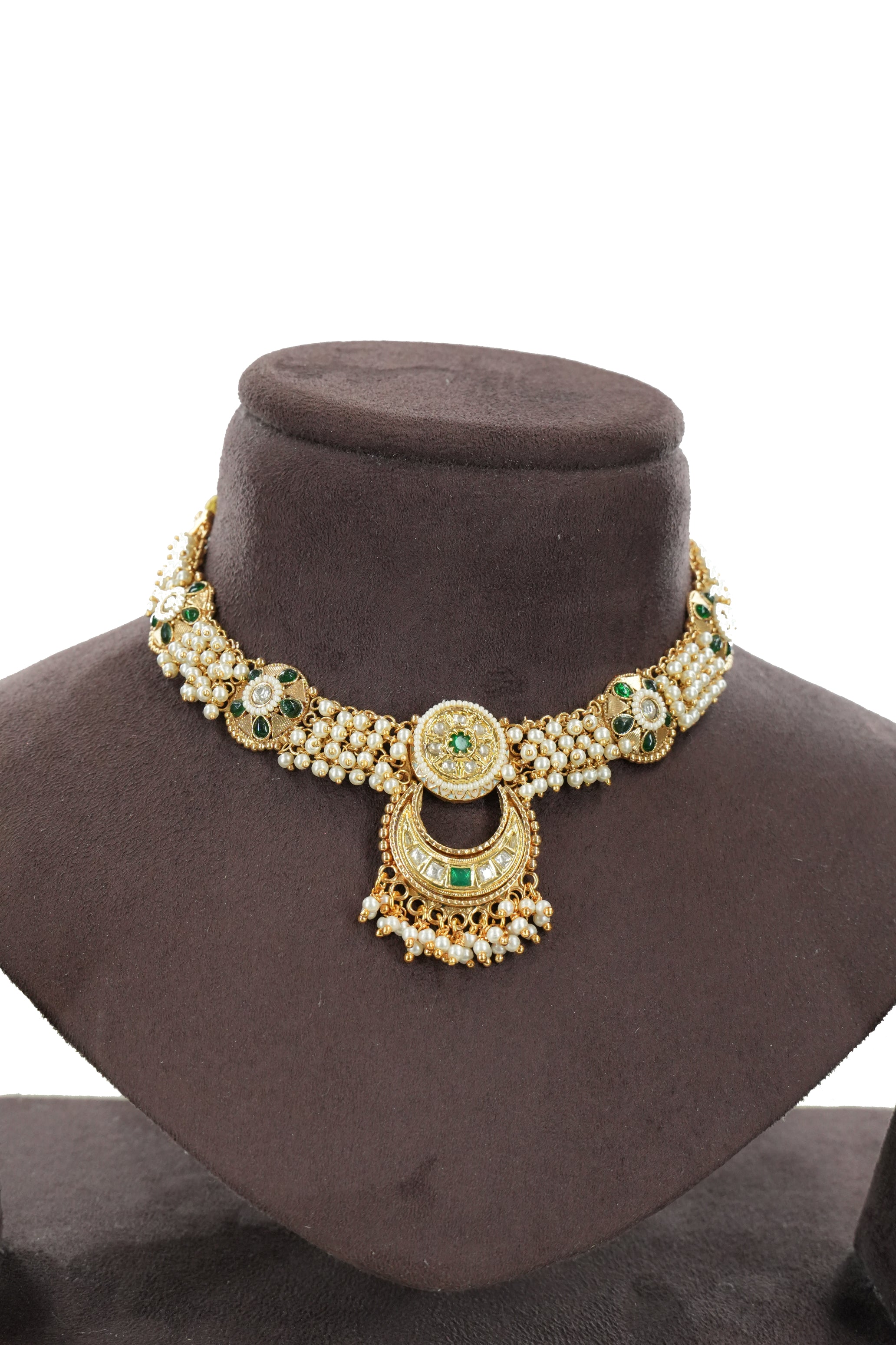 Whether you’re a bride, bridesmaid, or simply attending a festive gathering, this Pearl and Kundan choker set is a versatile piece that pairs beautifully with lehengas, sarees, and Anarkali suits.