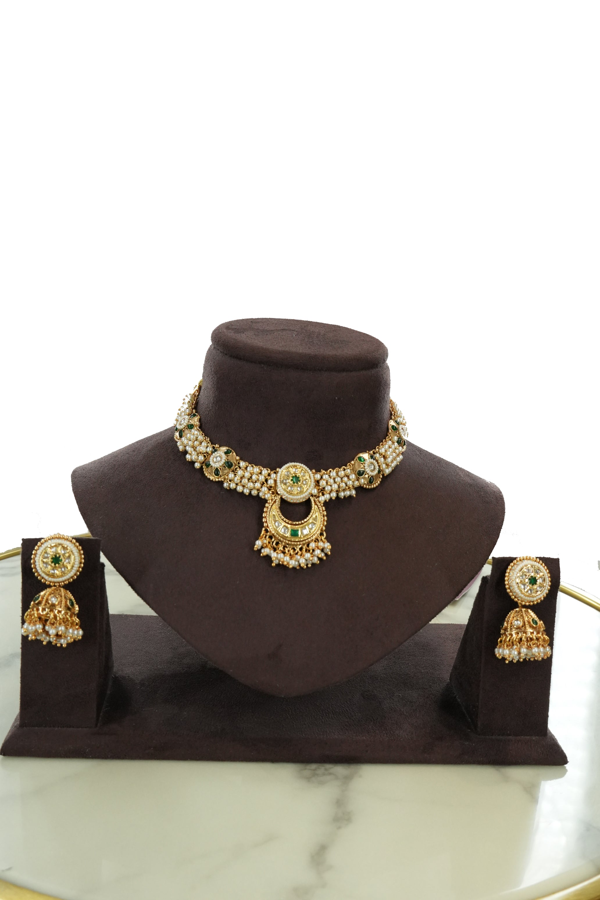 The choker sits gracefully on the neckline, making it perfect for weddings, festive occasions, or special celebrations. Paired with matching earrings, this set completes your ensemble with timeless elegance. Designed to be lightweight yet luxurious, it ensures all-day comfort without compromising on style.
