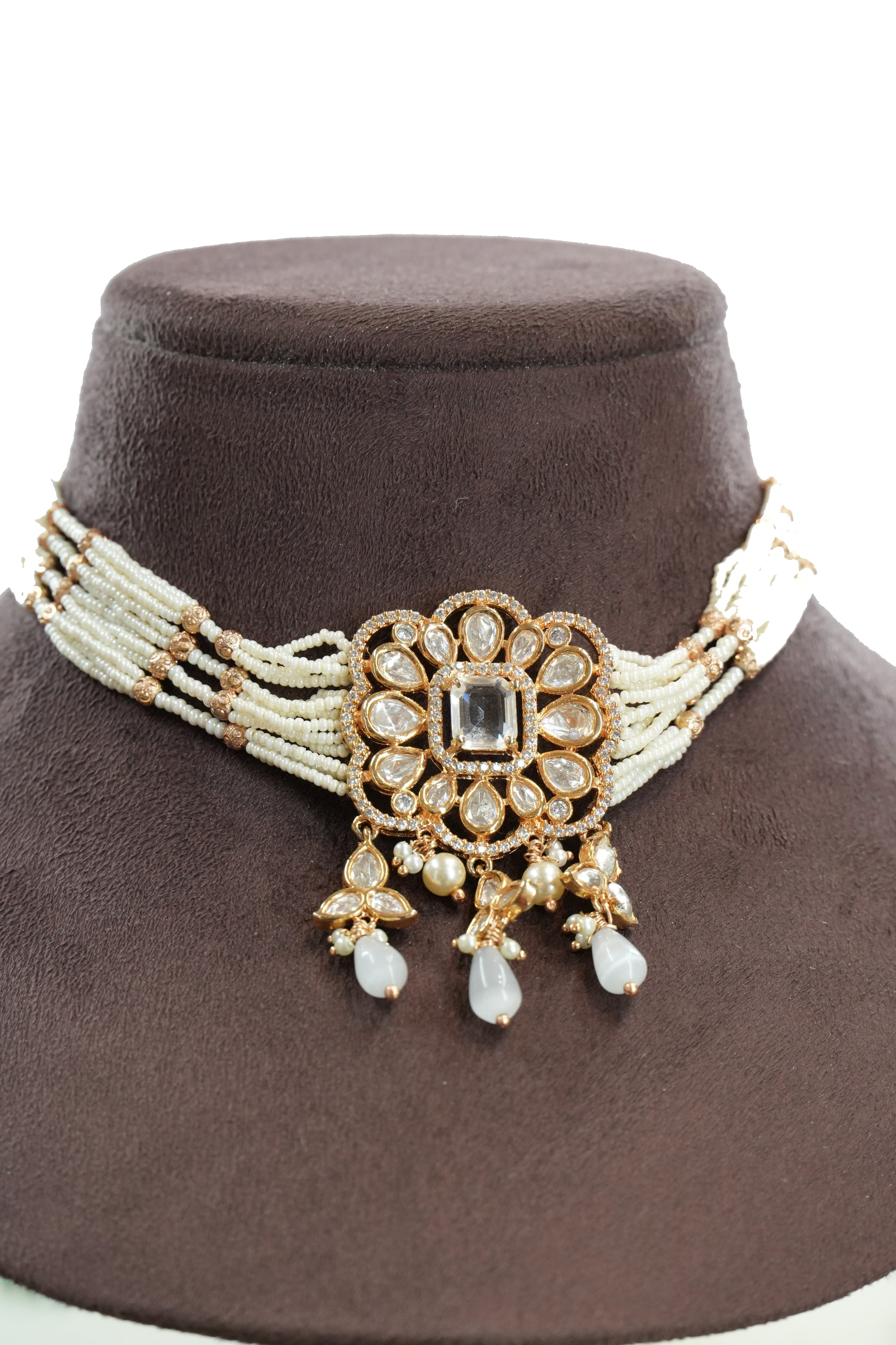 Pearl Beaded Kundan Choker Jewelry Set with Earrings