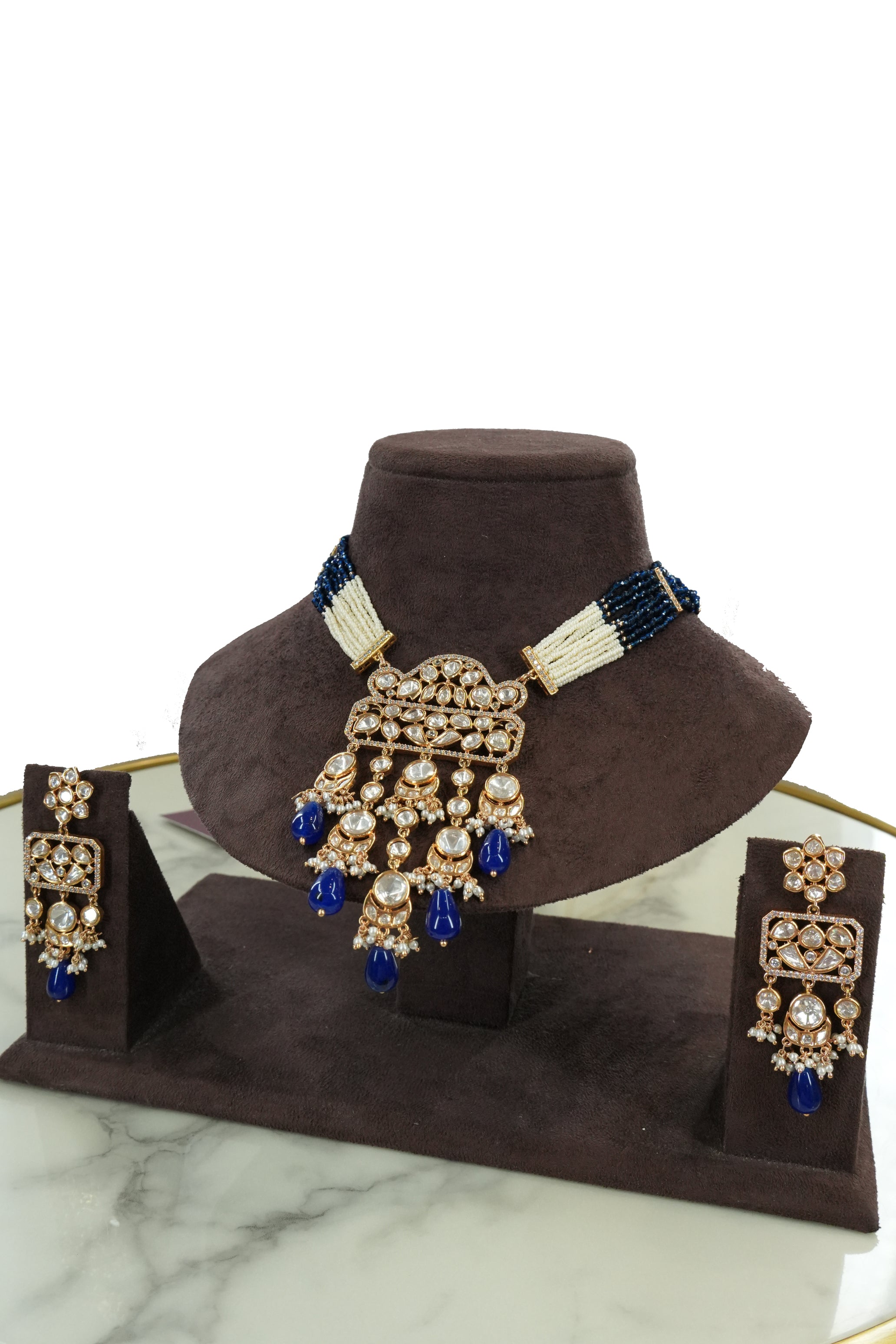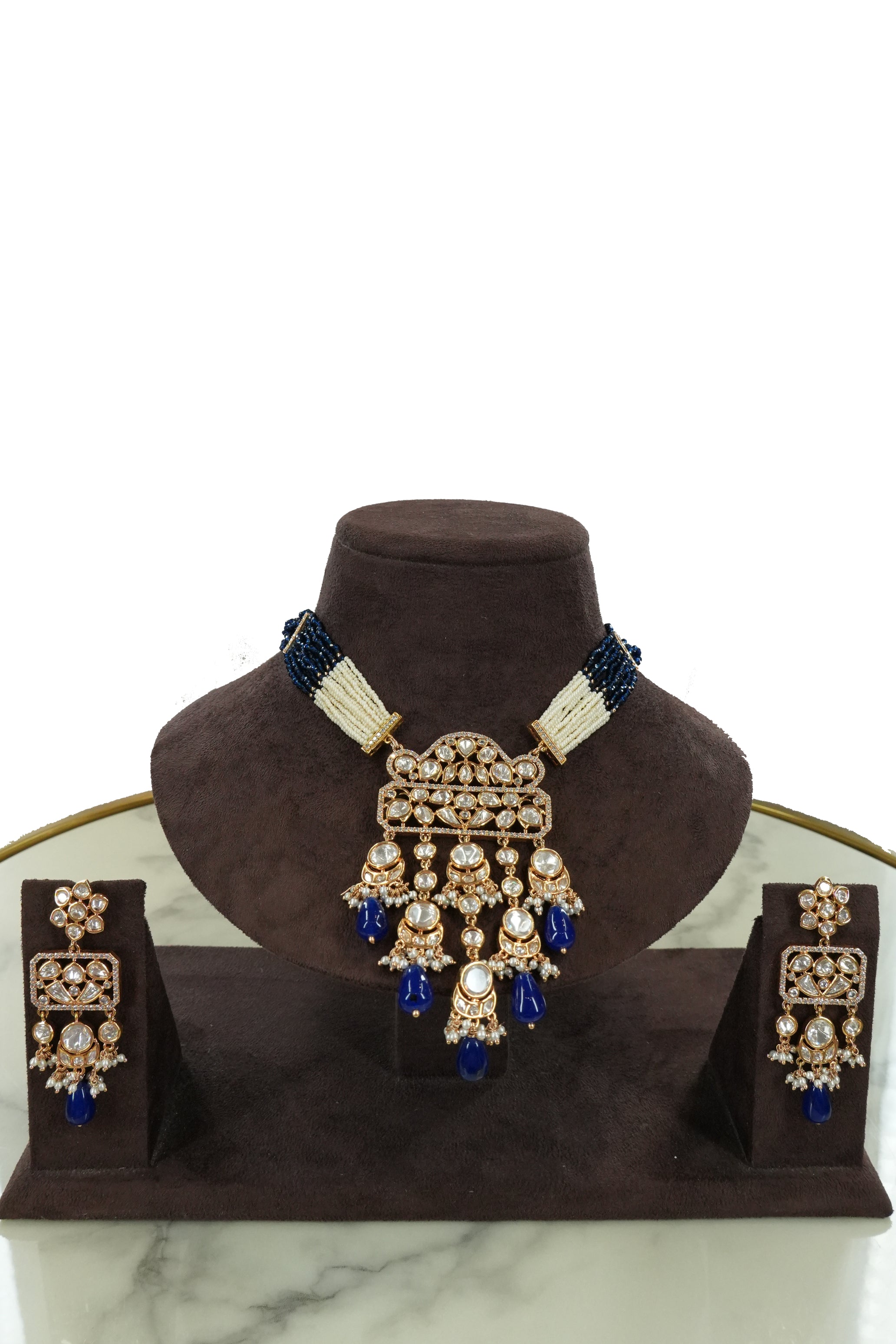 The bold royal blue tones paired with intricate Kundan detailing create a luxurious statement piece that complements sarees, lehengas, and Anarkali suits. Despite its grand design, the set is lightweight and comfortable for long hours of wear.